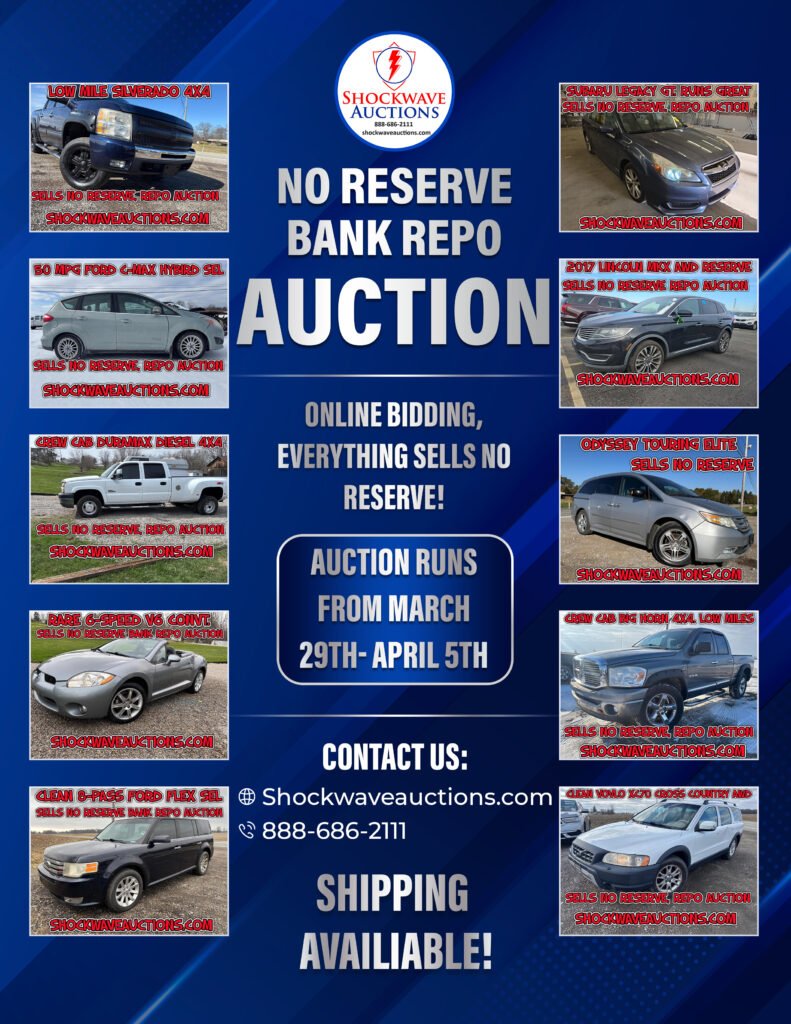 Shockwave Auctions is a nationwide auction house specializing in repossessed and commercial asset liquidation.  We offer a transparent buying experience with hundreds of detailed photos, test-drive videos, and virtual walk-around videos for every listing—so you know exactly what you’re bidding on.Â